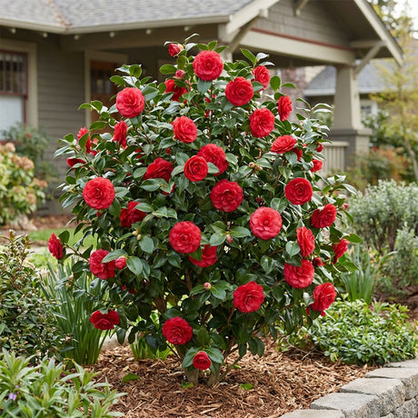 - Black Tie Camellia (Camellia japonica 'Black Tie') – Upright and compact with deep crimson formal double blooms, stunning as a clipped hedge or focal point.